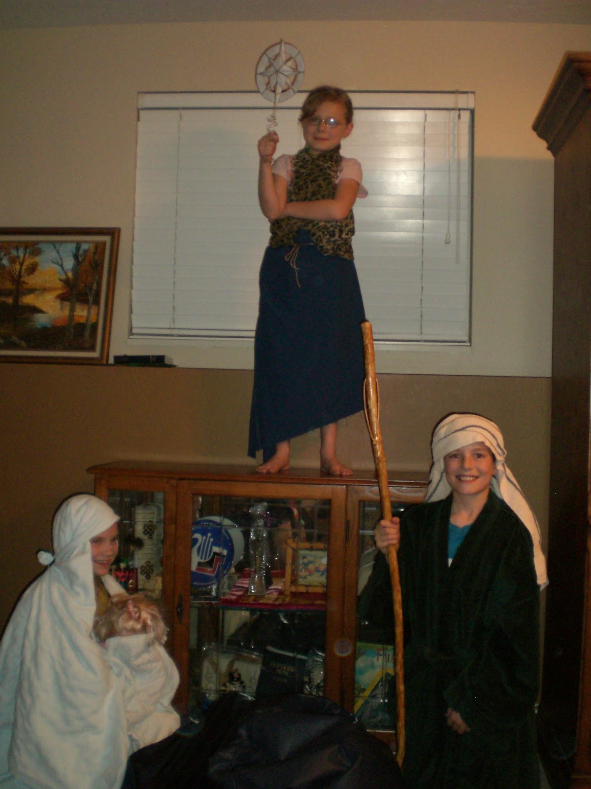 we had a nice, relaxed dinner, which included soup in breadbowls. w and s both thought the breadbowls were a cool idea. then we got down to business. we always have a family nativity play. this year, my mom decided we'd do a book of mormon christmas play.