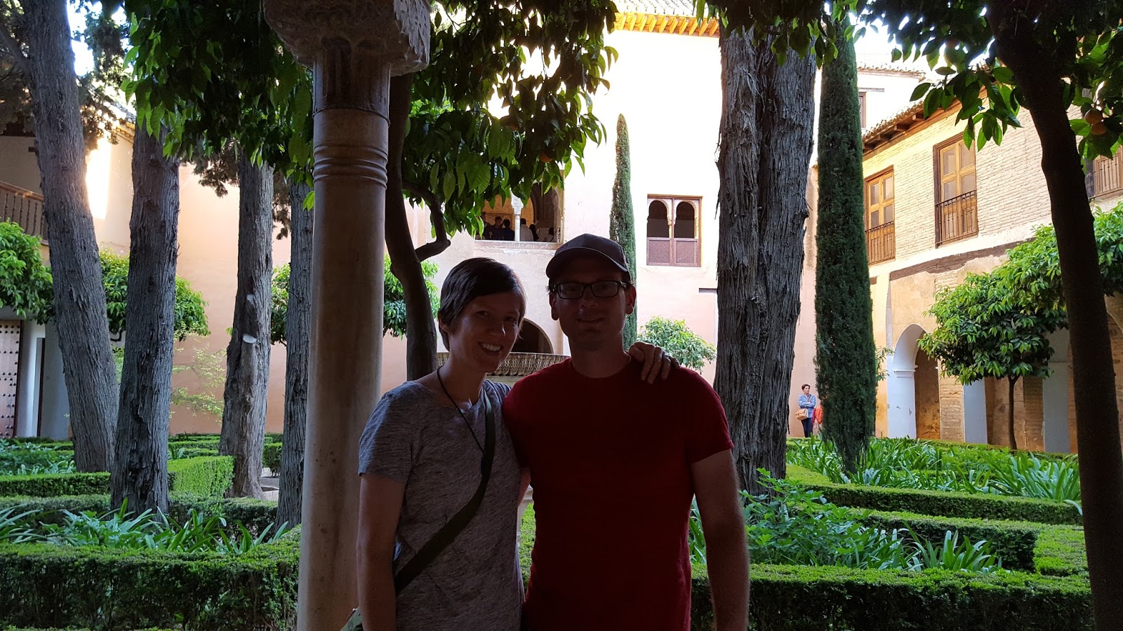 waiting to get into the main part of the alhambra (we did it in the evening; you have to have tickets with a reserved time, and this was the only time we could get). but it was a good time.